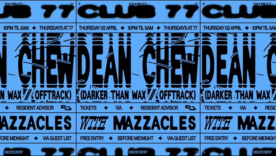 Catch Dean Chew (Darker Than Wax/Offtrack) with Mazzacles on Thursday 02 April at Club 77 from 10pm — 5am.